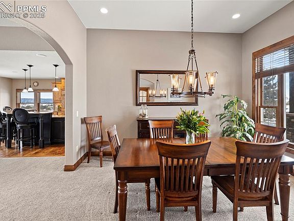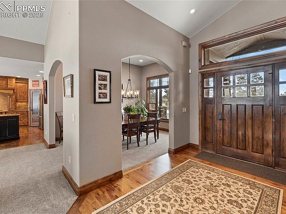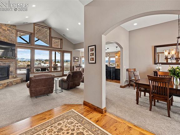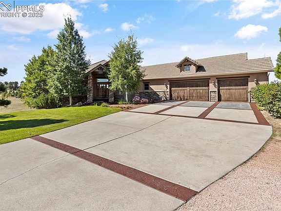 Discover the perfect blend of luxury & comfort in this stunning ranch-style home set on 2.5 acres, offering panoramic views of Pikes Peak just minutes from the city. This home welcomes you in with an open floor plan and impeccable craftsmanship throughout. The light-filled living room features a gas fireplace and a wall of windows framing breathtaking mountain views. The gourmet eat-in kitchen is a chef’s dream, with stainless steel appliances, knotty alder cabinetry, granite countertops, a gas cooktop, double ovens, a walk-in pantry, and a two-tiered island. The formal dining room adds ample space for entertaining. The luxurious main-level primary suite offers deck access, a remodeled spa-like bath with a free-standing jetted tub, dual shower heads, dual vanities, heated floor and a walk-in closet. The main level secondary bedroom also has an attached 3/4 bath. The walk-out basement is an entertainer's paradise, featuring a spacious family room with 9-foot ceilings, a dual-sided gas fireplace, a wet bar, and a hidden theater room accessible through a secret bookshelf entrance. Two additional spacious bedrooms with walk-in closets share a Jack-and-Jill bathroom. Outdoor living is elevated with a covered composite deck featuring a tongue-and-groove ceiling and gas line for grilling, as well as a lower-level covered patio with a gas fireplace—perfect for enjoying Colorado’s beautiful seasons & spectacular mountain views. Car enthusiasts will love the fully finished two level 5-car garage with epoxy floors, expansive storage, and gas lines for heaters. This meticulously maintained home includes countless upgrades: 2x6 exterior construction, stucco and tile roof, 95% efficient furnaces, central air, and newer water heaters (2020). Don’t miss this rare opportunity to own this luxurious estate!