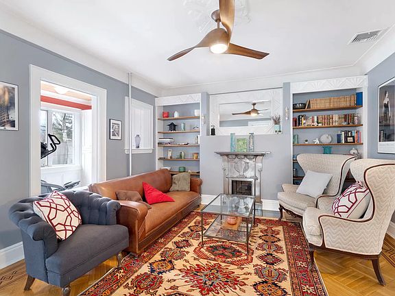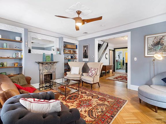 Welcome to 165 89th Street, this detached single family home with great natural light throughout, located on a tree lined block. With a total of five spacious bedrooms and two and a half bathrooms. The first floor features original parquet wood with inlay as you walk into a sundrenched front porch, living room, dining room, kitchen, pantry area and powder room. As you enter into the kitchen, you will find custom cabinetry, soapstone counters with beveled subway tile backsplashes, oak top island with seating, stainless steel appliances, and a separate pantry. Get cozy in front of the remote controlled gas fireplace in your living room while viewing your built in bookshelves. The second floor features four bedrooms and a full bathroom with original hardwood floors. The primary bedroom features a walk-in closet with a custom organizer vanity. The basement is being used as a large family room which also consists of a laundry room with Samsung washer and dryer, utility room, full bath, unfinished bonus room for your use. The basement, kitchen and all bathrooms feature hydronic heated floors. There is central air on the first and second floors and a mini split system in the basement. The heating system is a natural gas boiler with steam heat on the first and second floors. You can access the attic with the pull-down stairs with lots of storage space. The shared driveway leads to the backyard which features a gas grill and plenty of greenery.