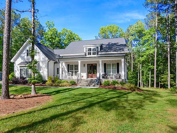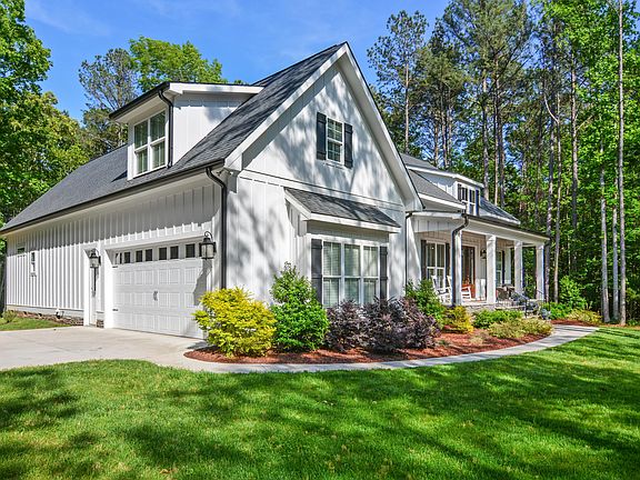 Fantastic ranch style home with 2nd floor bedroom and full bath nestled on nearly 4 acres. The ultimate retreat for tranquil and private living. Open floor plan. 10 foot ceilings. Luxury vinyl plank flooring throughout home. Spacious family room features built-in bookshelves & gas log fireplace. Formal dining room. Bright & open eat-in kitchen offers quartz counter tops, custom soft close cabinets, center island, tile backsplash & stainless steel appliances. Large walk in pantry. Mudroom area with bench + cubbies. 1st floor primary suite includes oversized tile shower, walk in closet & quartz top dual vanities + direct access to laundry room. Expansive covered back porch offers great wooded views. Oversized 2 car garage with epoxy floor. Four miles to Jordan Lake boat ramp for quick boating fun!