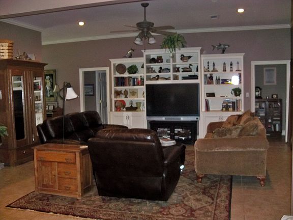 Beautifully landscaped corner lot in a quiet, friendly neighborhood. Has open floor plan, formal dining room, custom built-in entertainment center, elevated ceilings, gas fireplace, large master bath & Jacuzzi tub, walk-in closets, front porch/rear porch with covered patio, sprinkler system, alarm system, outdoor storage shed, double car garage, and boat garage.