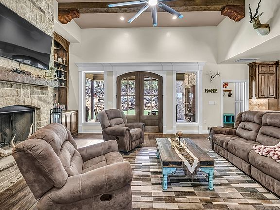 This stately custom home is situated on a hillside property with dramatic topography, large oak trees, moss-covered boulders and a breathtaking view over Lake McIntire and the surrounding valley. This home provides its owner with the ultimate escape from the hustle and bustle of the city. Yet is only a half hour from Weatherford atop Clayton Mountain. And the beauty is not limited to the location! When you walk through the massive iron front door you’ll see a dramatic two story foyer with curved staircase. Walking into the great room your immediately be drawn to the two story ceiling with beautiful decorative beam work. The home is filled with old world charm and quality finishes are immediately recognizable. A massive stone fireplace anchors the great room with open picture windows and custom French doors leading to the covered back porch and patio. The owners suite is on the ground floor with beautiful back yard views through the large windows. The kitchen is another anchor for the downstairs with large island your guests will surely gather around during get togethers. As you go upstairs you’ll find 2 bedrooms, 1 bathroom and sitting area with balcony that offers views that will leave you breathless. There is no doubt th balcony will host many morning cups of coffee and evening glasses of wine! The view over Lake McIntire will never get old. The home features spray foam insulation, a standing seam metal roof and tankless hot water heater. This home offers the ultimate in privacy with its dramatic hillside location where you can’t see another house and no other house can see yours. When you purchase this home you are buying real estate, but you are really buying a lifestyle unmatched anywhere in north Texas! Come see for yourself and you’ll never want to leave!