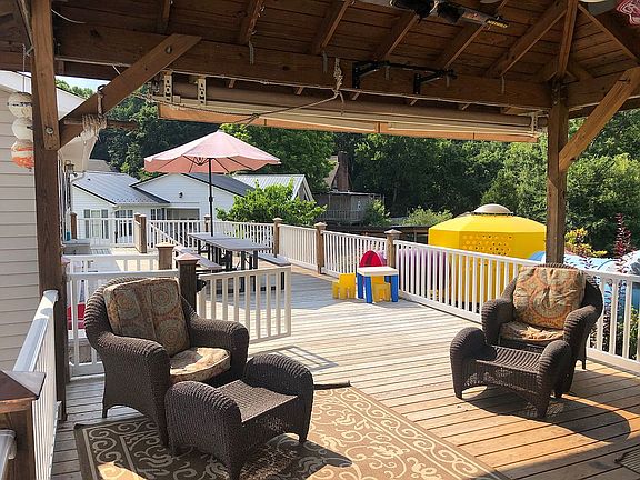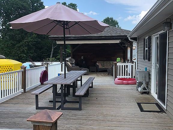 Three bed, office and two bath 1812sqft (With 916sqft additional bonus in basement) Waterfront Home with private dock and floater, in-ground Salt water pool, massive tube slide, spacious 2 car/boat garage, large partially covered lake/pool side deck with views and large covered front porch. The house was updated in 2014. Open floor plan with a Living room/ Dinning room/ Kitchen that is great for entertaining! Real Solid Brazilian Cherry Hardwood floors. Kitchen with Corian solid surface counter tops and large bar with view of the lake. Eight feet of water at private pier when full pond! Treated wood sea wall. Appliances included. community boat ramp and pier approximately 150 yards from house that cost $80 per year. Woodheaven shores is a very nice neighborhood! Stainless steel Appliances included.