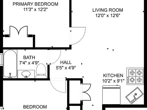This apartment features a spacious living room, queen-sized bedrooms, stainless steel kitchen, modern bathroom, hardwood floors, and windows that let in natural light throughout.