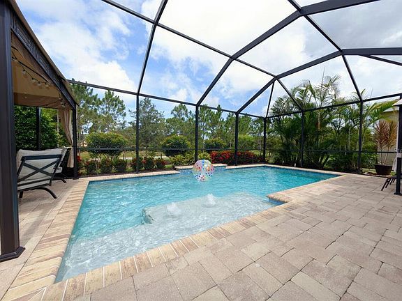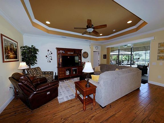 Shows like a model! No need to wait to build; this home is move in ready with all the top-end finishings! Built in 2017 this 3 bedroom + bonus room, 3 bath pool home offers 2100+ square feet of perfection from the cute front porch to the backyard oasis! Crown molding, shiplap walls, granite countertops, tile floors that look like wood, recessed lightening, coffered ceilings, and a split floor plan you need to see! The Kitchen has ungraded cabinets in abundance with crown molding and are a bump and stagger design. There is a walk in pantry, backsplash, gas cooktop plus an island breakfast bar to seat several people. This area opens to the Great Room/Dinning area perfect for entertaining! The inside oversized laundry room has a closet and storage. The spacious owners suite is tucked into the back of the home with its own sitting area, large walk-in closets and a large private bath. The other two bedrooms, one an en-suite, are set up perfect for kids or guests. There is a bonus room that can serve any purpose desired! The oversized paver lanai with an in ground, salt water, heated pool has a main covered area plus two portable gazebos! Private view out back facing West for amazing sunsets! The garage is also oversized. This gated community has low HOA fees! This location is amazing, close to schools, shopping, the new hospital, and I75 !