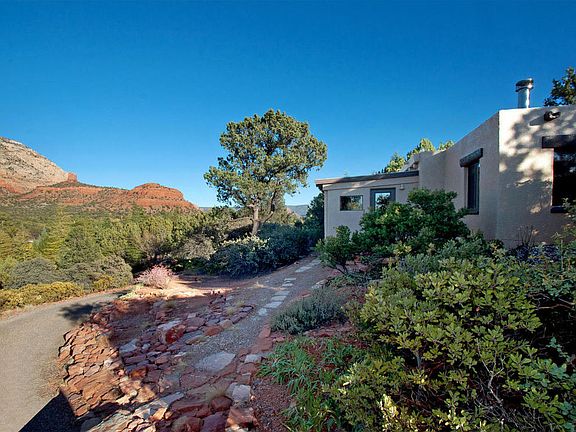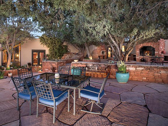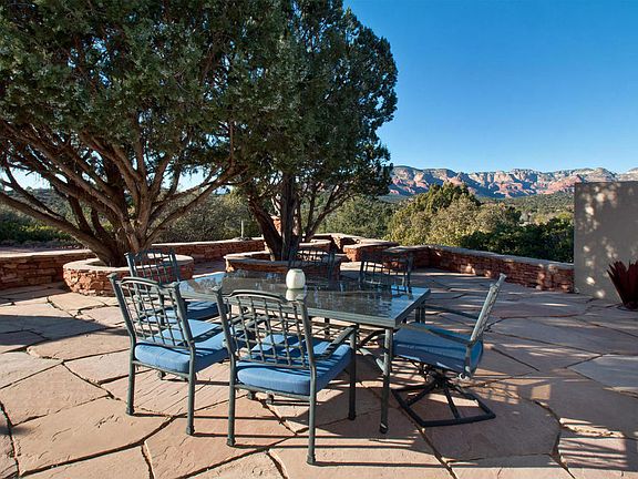 Views, privacy, historic Sedona charm, and plenty of room to stretch and grow. This secluded hilltop 3.5 acre estate is as ideal for getting away from it all and relaxing as it is for entertaining all your friends and family. Revel in the unblockable panoramic vista toward Boynton Canyon. Throw a memorable outdoor party on the huge Greek taverna-like flagstone patio with lights draping from the trees. Plenty of room to put up family and guests in their own quarters. The delightful and unique main house, on the north side of the patio, is built out from a classic Sedona red rock cabin. On the east-side is a more modern, spacious guest suite with high ceilings. On the south side is another fully-independent guest apartment.The possibilities for this versatile property are endless.