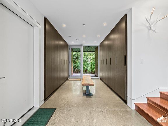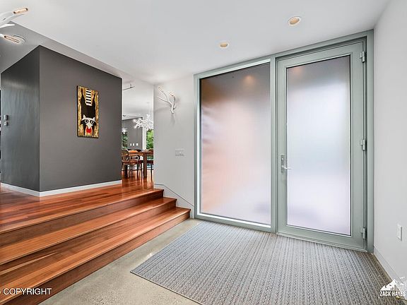 Nestled in one of Girdwood's most prime locations, just steps from Alyeska Day Lodge, Jack Sprat, The Bake Shop, and scenic trails this cedar-and-steel, Merit Award-winning home blends privacy, durability, and a deep connection to the outdoors. A short walk places you at world-class skiing, exhilarating mountain biking, or the serene paths of Moose Meadows no special-event parking required,simply step out your door. Venture up the private drive where the convenience of an oversized, heated two-car garage with ample storage awaits. It is also complete with shower, sink, and sauna to refresh after a day on the slopes or trails. At the homeowners' request, the architect and builder engineered a flat, snow-country roof with reinforced joists to withstand Alaska's heaviest winters. Step inside to a ski-ready mudroom, thoughtfully appointed with built-in lockers for snowy gear after a day on the slopes or trails. Beyond, custom-crafted windows and doors hush the outside world, ensuring comfort and quiet throughout the home. The main level showcases a soaring, two-story living area with floor-to-ceiling windows, bathed in natural light and anchored by a wood-burning stove. The open flow connects the dining area and kitchen, while just beyond, a private wooded courtyard extends the living space outdoors perfect for quiet mornings or intimate evenings under the trees. The primary suite is conveniently located on this level for easy main-floor living. Upstairs, a second living area with a cozy loft frames dramatic Chugach Mountain views. Two additional bedrooms, a laundry room, and a full bath complete the floor. One bedroom features a Murphy bed for flexible guest or office use. Step outside to the living roof, offering sweeping vistas and ample gardening possibilities. The lower level offers over 1,100 sq. ft. of versatile living space. Currently enjoyed as a recreation room, it is thoughtfully plumbed for a future bathroom and finished with egress window making it an ideal opportunity for an in-law suite or guest quarters. Offered fully furnished, this residence is move-in ready for effortless enjoyment before ski season. Thoughtfully designed with light, privacy, and nature in mind, it embodies both luxury and comfort for year-round retreat living.