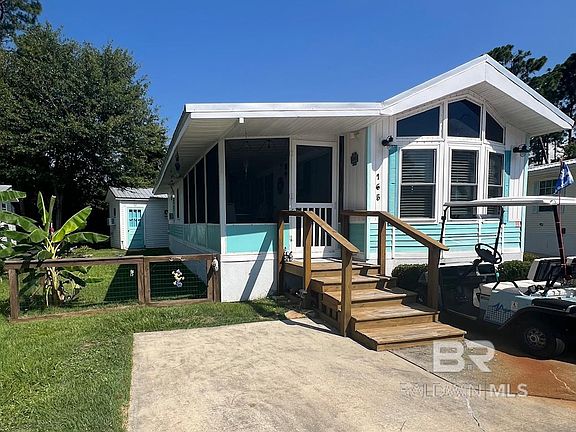 Quaint Coastal 1 Bedroom/1 bath home with storage building, possible boat parking on the property, and golf cart to convey at $0. This beautiful property can easily be converted into a 2 bedroom home and has a 1/2 bath in the outdoor building (freezer conveys at $0). This bright cheerful property has been newly painted with many updates including: new metal roof in 2017, new porch screens in 2023, HVAC in 2014, the home has been secured for inclimate weather with hardy board and stucco skirting and the property has a termite treatment contract. The spacious kitchen has eat in dining and storage galore. There is a convenient laundry room inside the home and includes an enclosed bright screened porch perfect for entertaining and a backyard with a privacy fence that is ideal for pets. This property is in the highly desired, safe, pet friendly, beach neighborhood of Spanish Cove, a coastal paradise gracing the shores of Perdido Bay, just 5 minutes from the Lillian boat launch and only 15 minutes from the sugar white beaches of the Gulf of Mexico. There is something for everyone in this exclusive golf cart community that sits on the Alabama/Florida line. Owners enjoy membership with a lifestyle full of amenities and remarkably affordable POA Dues of only $74/Mo (dues paid quarterly) and includes trash pick-up, 24 hour security, and key FOB entry into all facilities. Don't miss out on the opportunity to make this bright and airy retreat your own! Buyer to verify all information during due diligence.