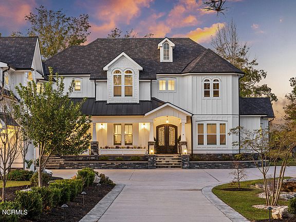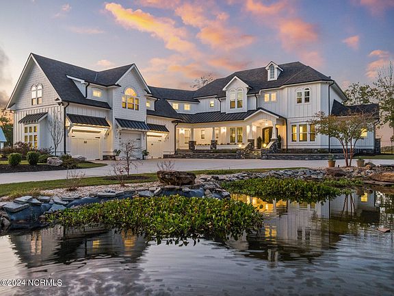 Imagine waking up in your dream home, where every detail has been meticulously crafted and custom-built. This estate offers a sanctuary of sophistication. As you enter through its entryway with high ceilings and elegant ironwork doors, your attention is drawn to one of the most beautiful sites in eastern NC, located on a high bluff with expansive views overlooking Virginia Creek. The beautifully landscaped grounds, serene water views, neighboring horse farm and open natural spaces, offers a peaceful escape from the hustle and bustle. The home showcases classic elegance with a modern touch, featuring white board and batten siding, black metal awnings, and stone accents. Once inside you're greeted by high ceilings, hardwood floors, and an abundance of natural light. The entrance opens to a lovely formal dining room with coffered ceilings. The gourmet kitchen and a spacious butler's pantry, flows seamlessly into expansive living spaces. Exquisite 6x12 granite island and countertop, Subzero refrigerator, Miele dishwasher and custom pantry bring premium functionality and ample storage. The tile backsplash adds a unique touch to the Wolf Gourmet 6-burner gas range featuring an extra-wide griddle and double electric ovens. This kitchen is a chef's dream. Thoughtfully designed for both comfort and luxury, the master suite offers floor to ceiling windows. The luxurious master bath features a spacious walk-in shower and steam room with an infinity tub, marble surfaces, and herringbone mosaic tile that feels like a private retreat. Upstairs boasts a separate laundry area, enormous Bonus Room, Theatre Room and 3 bedrooms large enough for sitting areas, each with their own private bath.
