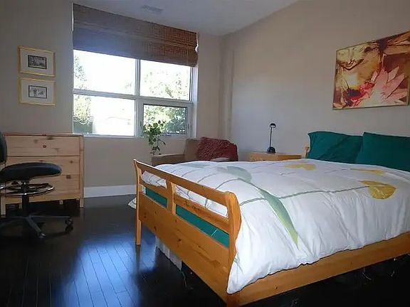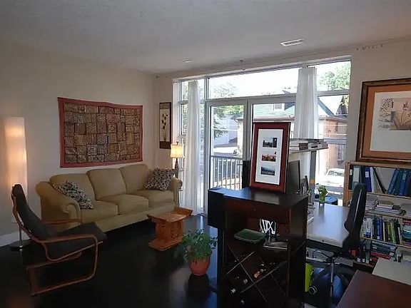 Enjoy the farmer's market every Saturday right next door! The unit features high ceilings and floor-to-ceiling windows in the living room with double doors that open to a Juliet balcony. Gorgeous dark hardwood flooring throughout (with tiles in the entrance way, utility room, bathroom and kitchen).