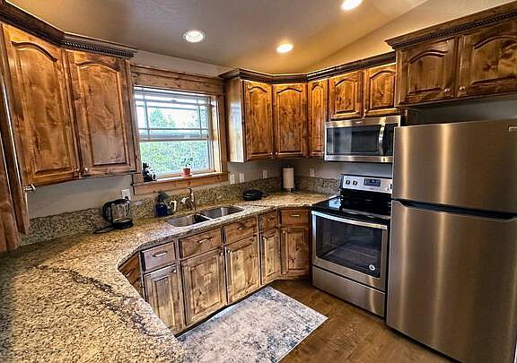 Experience your own private paradise near stunning mountain lakes, ski resorts, and endless adventures right from your front door! This fully furnished home offers ample space for your toys and hobbies, featuring a spacious shop with 2,500 square feet, of which 2,000 square feet are available to the tenant. The living area includes two bedrooms and two bathrooms, totaling approximately 1,200 square feet.