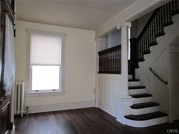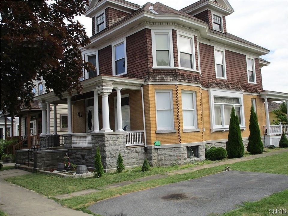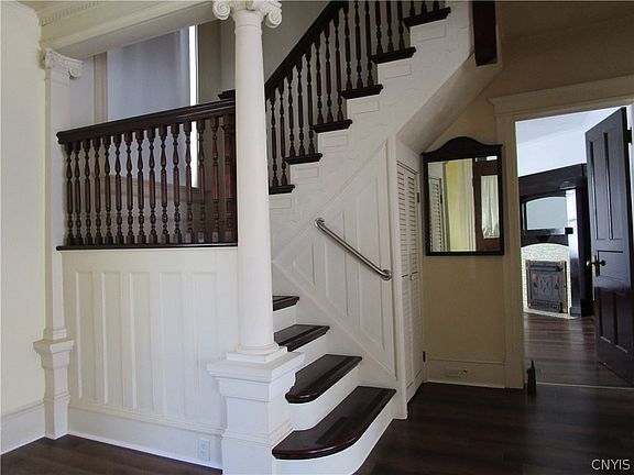Looking for that special older home built with quality and character...look no more! This solidly built American Foursquare is truly a one-of-a kind beauty! Amazing craftsmanship can be noticed at every turn--the gorgeous foyer, spindled staircase, leaded glass transom windows, solid wood interior doors, dentil moldings, architectural columns, hardwood floors, natural woodwork and so much more! A stunning entrance foyer, large Living Room, formal Dining Room with beamed ceiling and judges paneled wall accents, Family Room with fireplace, pantry with original cabinetry, a well equipped, updated kitchen with range, refrigerator, and microwave, a pleasant back porch and convenient quarter bath off the kitchen. Easy-to-care-for vinyl flooring installed in 2021 on first floor. Spacious second floor bedrooms offer hardwood floors; numerous vinyl replacement windows have been installed upstairs. There is a full, walk-up attic, which offer limitless finishing possibilities. Garage behind the house provides space for workshop or that special hobby!