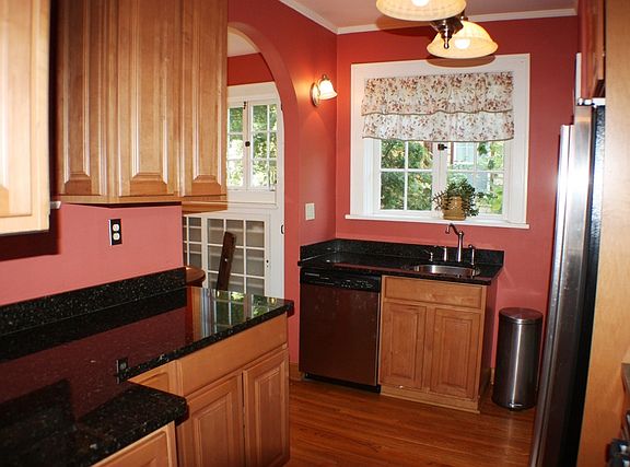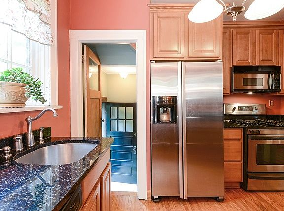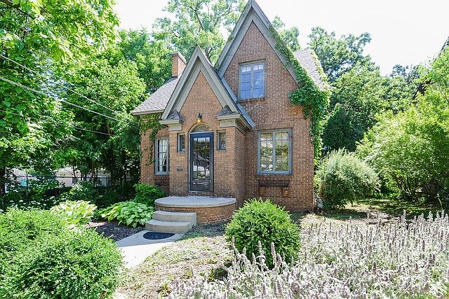 Charming Tudor cottage with original woodwork, interior doors and many lighting fixtures. Enjoy the refinished hardwood floors, brick fireplace and sunny family room with 3 walls of windows overlooking wooded back yard. Beautiful remodeled kitchen and breakfast room with maple cabinets, granite counters and high end stainless steel appliances. Awesome updated bath with porcelain and marble walk in rain shower. Private roof top balcony off of master. Newer architectural roof, hi-efficiency furnace and a/c. Detached 2 car garage plus carriage room in walkout basement.