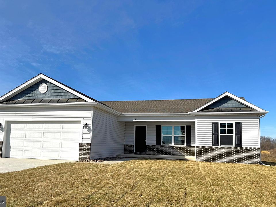 To Be Built 1342 sqft Rancher with open floor plan, vaulted ceilings and LVP Flooring in main living areas, and Kitchen with island, granite countertops, and stainless steel appliances. The primary bedroom has full bath with tile shower and large walk-in closet. The exterior features brick accents on front, 2 car garage with auto opener, and concrete driveway included.