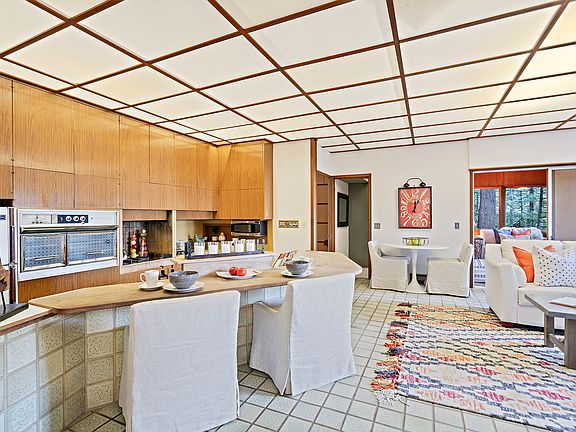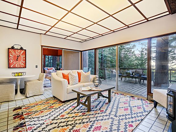 Private home retreat nestled in a 5 1/2-acre Redwood forest with a view of the Bay and heritage Redwoods, just eight minutes up the hill from downtown Woodside and Highway 280. Custom built mid-century modern style home with a strong Japanese influence offers an expansive open living space, sunken kitchen, and solid Mahogany trim. The living room features a truly one of a kind Kachelofen style masonry heater, along with a gas fireplace in the family room. Large Bay windows bring the outside in, delivering calming forest views right to your couch and master bedroom. An expansive deck wraps around one side of the home, offering a relaxing setting to entertain and soak in the beautiful scenery. Additional shop/studio over a three-car carport. While the property enjoys peaceful seclusion from the commotion of city life, it is just a three-minute drive or healthy hike to Alices Restaurant, a gas station, and a general store.