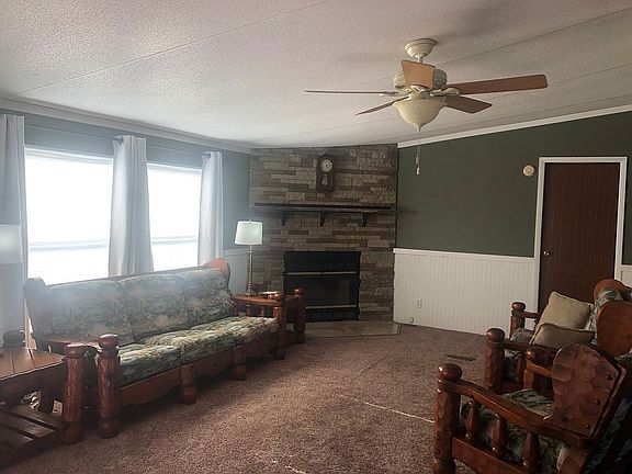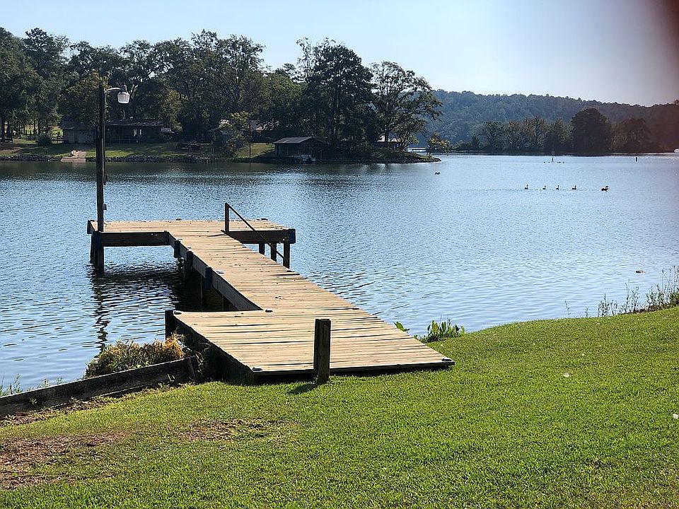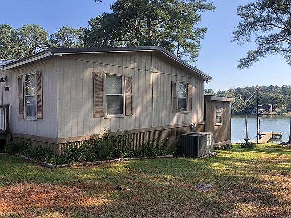 Weekend getaways or full time lake living that is MOVE IN READY. This beautiful 3 bedroom 2 bath home offers 75 ft of waterfront year around in a calm slough with breathtaking views. The large covered deck is a dream for entertaining with an extended grilling deck for all your cookouts. There are plenty of spaces for entertainment, including a stone patio, a smaller deck, spacious yard, and a 16 ft x 12 ft pier with new boat cleats, solar lights and stairs to a nice swimming area with all the pet fish our granddaughter has hand fed, raised, and over the years. The yard has a controllable light pole for night time activities along with the pier including the 55 ft walkway of solar lighting. There is a large storage building to keep all your lake toys, boating and fishing items in. See all the activity and beautiful views from the kitchen window and glass doors. The kitchen features stainless steel appliances, a breakfast bar, and an eating area open to the family room featuring a cozy stone wood burning fireplace for the winter days. The master bedroom boasts a walk in closet, walk in shower and soaking tub. The laundry room has an outside entrance from the lake to drop wet items. The hvac system was installed in 2016 and has routinely been serviced. There is parking for 7-8 vehicles. A community boat ramp. In 2020 new pier, 2023 new metal roof w/ transferable contract, 2023 trees removed for the beautiful views. Our family has leased this lot from the owners since the early 80’s. A change of homes on this lot in 2015.