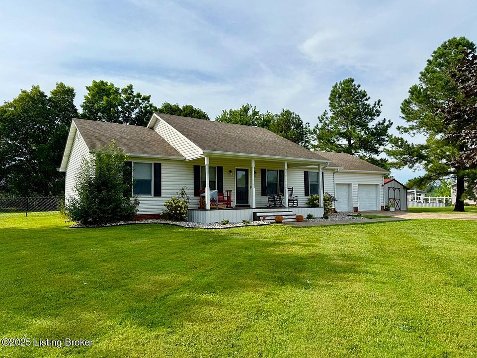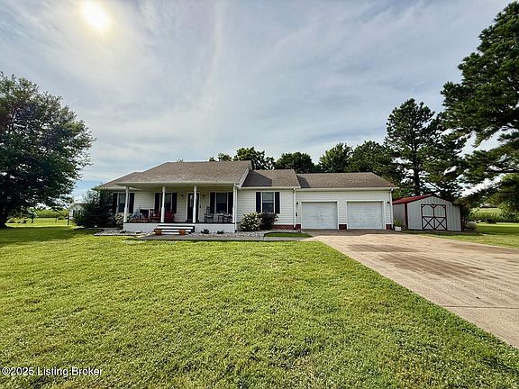 Nestled on 0.91 acres in the sought-after Honeysuckle Estates, this stylish 3-bed, 2-bath home offers 2,250 square feet under roof, including 1,450 square feet of living space plus a bright 249-square-foot sunroom—ideal for morning coffee or winding down in the evening. A 2-car garage, versatile shed, and large fenced backyard shaded by mature trees offer plenty of space for kids, pets, or outdoor fun. Whether you're starting out or settling in, this home blends comfort and charm with a peaceful setting just minutes from schools, shopping, and dining in Leitchfield.