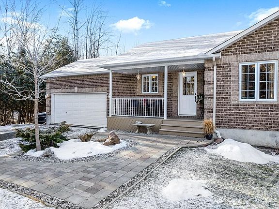 The graceful design of this home is most pleasing and its flowing open layout lets you raise your family, or retire, with ease. Nestled on private acre, 3+1 bed, 2 bath custom bungalow upgraded with style and lovingly maintained. Livingroom vaulted ceiling, corner propane fireplace and custom blinds. Dining area patio doors provides full light and deck access. Bright white kitchen has granite counters and breakfast bar accented with exquisite porcelain. Primary bedroom adorned by elegant chandelier and has walk-in closet plus windows overlooking quiet landscape. Cheater door to luxury bathroom of floating quartz vanity with porcelain sinks, honeycomb backsplash and glass shower. Lower level familyroom, rec room and impressive wet bar with wrap-about seating. Plus, 4th bedroom, 3-pc bath & laundry room. Attached double garage inside entry and door to deck with screened gazebo. Amish 2022 shed. Driveway resurfaced 2019. Curbside garbage pickup. Bell hi-speed. Cell service. 10 mins Perth.