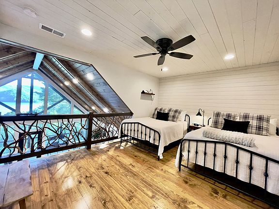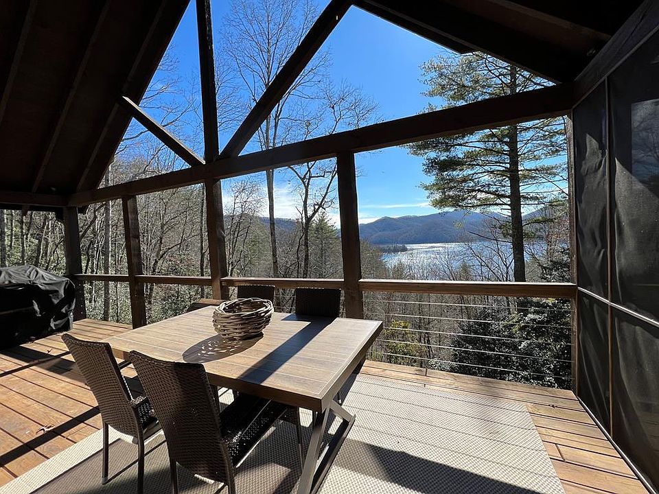 Overlooking Lake Nantahala w/impressive views! Custom built 2 Bedroom 2.5 bath, with master & laundry on main. Easy Access to this pottery barn style home. Large, covered deck, with screened in deck off master bedroom. Oversized Master bedroom, with great master bath. Close to Wayah Bald-hiking, fishing, trout waters. Wood Burning fireplace in Great room, very open feel. Sitting on over an acre, feels very private. Sit out by fire or enjoy the hot tub. Lake access is available for additional fee-take your side by side down to the lake area dock. established rental property.
