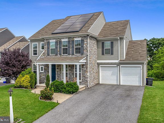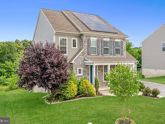 Welcome to 165 Lark Dr in the highly sought-after Highlands community! The Charter Homes Griffen Estate plan is filled with natural light and offers an ideal location with a multitude of luxurious upgrades. Situated in the top-ranked Northeastern York School District, you’ll enjoy access to excellent educational opportunities. One of the standout features is the state-of-the-art solar system, (which the seller will pay off at closing). Energy savings are easy with the fully equipped Tesla solar panels and Powerwall, plus there’s an EV charging station for your electric vehicle needs. This means you can enjoy virtually free energy! The home is all-electric, promising significant savings on your energy bills. Upon entry, you'll immediately notice the sophisticated appointments throughout. The high ceilings and doors create a feeling of luxury. The main floor includes a private office, a formal dining room, a spacious half bath, and an expansive great room that flows seamlessly into the breakfast nook and the stunning kitchen. The designer kitchen, truly the heart of the home, features a large island with seating, white-painted maple cabinets with 2” crown molding, granite countertops, and a butler’s pantry that connects to the dining room. The breakfast nook, with its wall of windows, provides serene views of the backyard and an abundance of natural light. This space is perfect for social gatherings of friends and family! The mudroom, complete with lockers for organized storage, leads to an oversized two-car garage with epoxy floors. The spacious composite deck is perfect for outdoor entertaining and has stairs to grade for ease of access to the backyard. Upstairs, you’ll find the primary bedroom which is a true retreat! Measuring 16’x17’, with a large walk-in closet and an en-suite bathroom featuring a soaker tub, shower, and double bowl vanity. Additionally, you'll find three bedrooms, each with generous walk-in closets, a full bath, and a conveniently located laundry room. The expansive walk-out basement is ready for your personal touch and is pre-plumbed for a future full bathroom (including an ejection pit for a future pump). The possibilities are endless! The large .42-acre exterior lot backs onto woods, offering privacy and a serene setting. With an efficient heat pump and central air system, you’ll be comfortable year-round. Newly installed fiber optics in the street provide more choices for your cable and internet connection! This home is perfect for commuters to Harrisburg or York. Minutes from shopping, I-83, the PA Turnpike, restaurants, golf courses, and entertainment. Don’t miss the opportunity to make this luxurious, energy-efficient home yours!