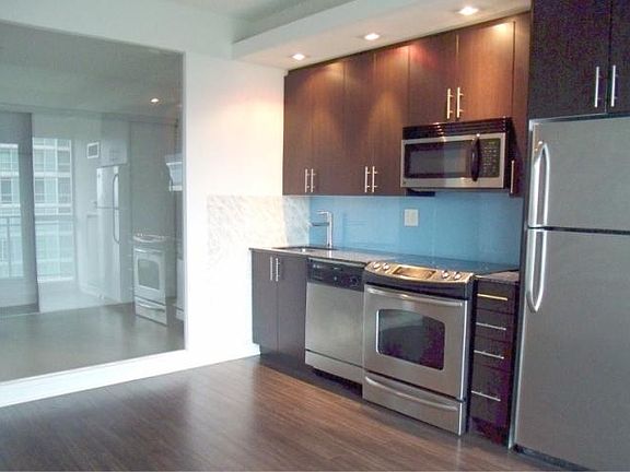 Modern 1 bed 1 bath condo with easy access to downtown Toronto. Steps to TTC, streetcars, Metro supermarket, restaurants, cafes, etc. One underground parking spot is included in the rent. Located between Lakeshore Blvd W and Parklawn Road. The unit has large windows with a lot of natural lights and a spacious balcony with exceptional unobstructed city views. Laminate flooring throughout (except bedroom with carpets cozy and warm during winter). An open concept unit with 9 ft. ceiling and Granite countertop on kitchen. Extras: En-suite Washer & Dryer, Full size Fridge, Stove, Dishwasher, Built-in Microwave, All Elf's, Shelves in Kitchen, Thermostat, AC, Heater, Window coverings. Five-star Amenities include Gym, Indoor & Outdoor Pools, Roof-Top Terrace with BBQs, Party Room, Guest Suites, Volleyball Yard, Squash Room, Billiard & Movie Room, 24 hour Concierge, Secure Underground Parking, Library, and many more! AAA tenants are required to rent the unit. Pets and smokers are not allowed. All utilities are included except Hydro. Rent includes one parking space.