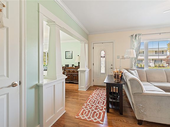 Celebrate the holidays in this cozy & immaculate brick ranch ~ cherry hardwoods flow through the living and dining rooms, hallway and bedrooms; natural light radiates through the living room, accented with a gas fireplace and crown molding; columns and corner window greet you in the spacious dining room; Quartz counters, GE Profile appliances and plenty of counter space in the new white kitchen with breakfast nook; relax in the den, off of the kitchen, featuring exposed brick, another fireplace and loads of sunlight; bedrooms are a great size and have plenty of storage; lower level is a blank canvas, cedar closet, storage galore and a brand new full bath! Enjoy the fall evenings on the covered trex deck; table-top flat rear yard, accented with wooden split-rail fencing, provides plenty of space for gatherings; detached garage offers parking and storage! Nothing to do - but move right in!
