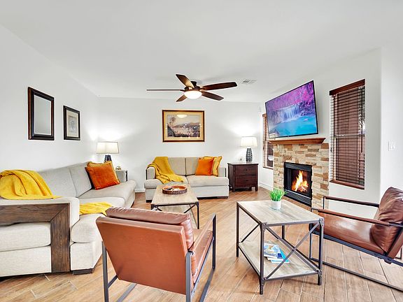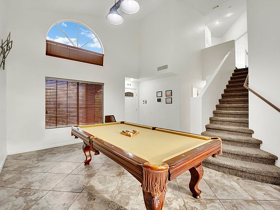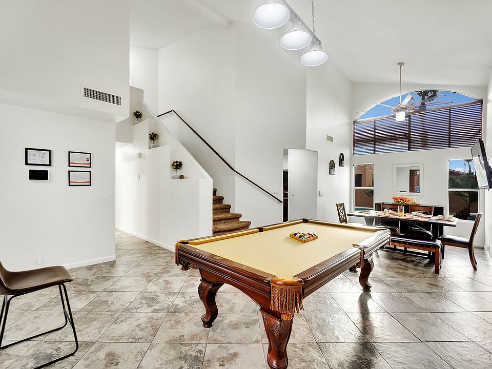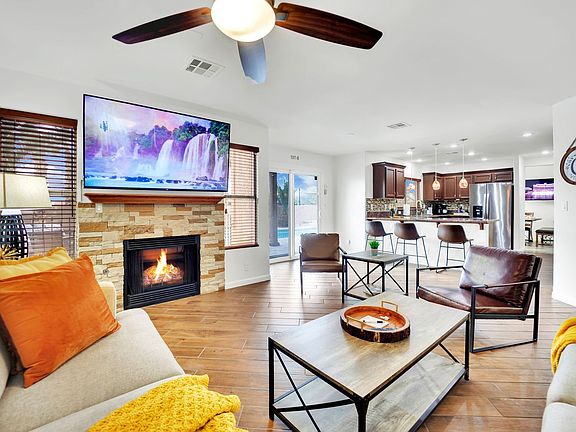 Welcome to Heritage Haven Villa, a premier property boasting an exquisite four-bedroom, three-bath sanctuary nestled in the vibrant community of Henderson, Nevada, just steps away from the renowned Heritage Sports Park. This meticulously remodeled single-family residence spans 2,184 square feet of luxurious living space, perfectly situated on a generous corner lot of 6,534 square feet. Experience stunning views, amazing nights, and a peaceful environment in this beautiful property. Step inside to discover a retreat of modern luxury, where every detail has been thoughtfully curated to enhance your lifestyle. Admire the newly renovated interiors, featuring wood-like tile planks, sleek new vanities, and glistening granite countertops, creating an ambiance of sophistication and comfort. The main level presents a thoughtfully designed layout, featuring a convenient one-bedroom, one-bath arrangement ideal for accommodating guests or extended family members. The primary bedroom offers an unparalleled retreat within the comfort of your own home. Step into luxury as you are greeted by a spacious king-size bed, inviting you to relax and unwind in style. Admire the elegant fireplace, which serves as a captivating centerpiece, with its see-through design allowing for cozy ambiance on both sides. A comfortable sitting area and workstation are included for any needed projects. Indulge in ultimate relaxation in the en-suite bathroom, featuring a luxurious soaking tub and a separate shower, providing a spa-like experience. Step outside onto your private patio to enjoy breathtaking views of the shimmering pool, majestic mountains, and the dazzling lights of the Las Vegas Strip. The two additional bedrooms are thoughtfully designed to provide comfort and convenience for family members or guests. Each room features a full-size queen bed, ensuring a restful night's sleep. Connected by a Jack and Jill bathroom, these bedrooms offer practicality and privacy, making them perfect for kids, friends, or extended family members. The kitchen is designed with both functionality and socialization in mind. With an open layout that seamlessly connects to the living room, it creates the perfect dining and entertainment space. The open design fosters a sense of togetherness, ensuring you never miss a moment with guests while preparing culinary delights. The spacious living room serves as the heart of the home, offering ample space for relaxation and entertainment. Enjoy cozy nights by the fireplace or catch up on your favorite shows with smart TVs strategically placed throughout the living, dining, and bedroom areas. Hot tub heated free of charge and pool heating available for an additional fee of $150 per day, requires 24 hours notice. Pool temperature ranges between 83-85 degrees when heated. This home is dog-friendly. A maximum of 2 dogs are allowed with a fee of $100 per dog for the entire stay. Properly curbing and picking up after the dogs is required. With garage parking and three dedicated parking spaces, Heritage Haven ensures ample room for all your vehicles and outdoor gear. Conveniently located just 20 minutes from the airport and 25 minutes from the Las Vegas Strip, Heritage Haven Villa offers the perfect blend of vibe, tranquility, and excitement. Whether you're jetting off on a weekend getaway or exploring the attractions of the Strip, you'll appreciate the ease of access from your luxurious home base. Enjoy easy access to recreational activities at the nearby Heritage Sports Park. Minutes away from Henderson's new Ice Arena, it's perfect for hockey and skating families. Whether you're cheering on young athletes or exploring the outdoors, this home offers a blend of relaxation and recreation. Guest verification is required to confirm a reservation. A verification link will be sent via Guest Ranger from a 415 area code. Completing this process is necessary to secure your booking. Failure to comply may result in cancellation.