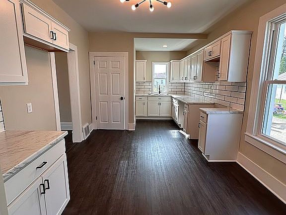 4-bedroom, 1-bathroom house for sale. Newly remodeled inside and out, including a brand new kitchen, flooring, paint, bathroom, windows, siding, furnace, and more. Laundry conveniently located on the first floor. Large fenced-in backyard.