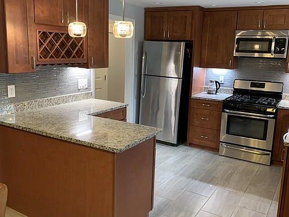 - Kit Dscrp: Countertops - Stone/Granite/Solid, Cabinets - Upgraded, Flooring - Stone/Ceramic Tile, Breakfast Bar / Nook, Stainless Steel Appliances, Open Floor Plan, Remodeled, Lighting - Pendant
