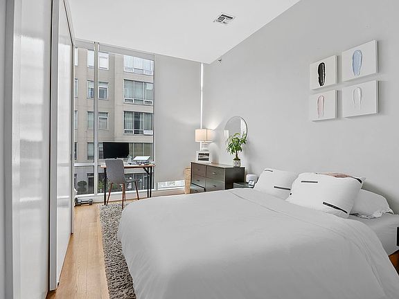 The apartment features 9'-9"ceilings and floor-to-ceiling windows with brilliant natural light. The kitchen is finished with wood and lacquer cabinetry, recessed lighting and stainless steel Bosch appliances. The spa-like bathroom features double Kohler sinks, Caesarstone countertop, and a Bosch washer and dryer. The large bedroom offers wonderful views and a generous closet.