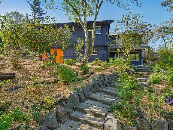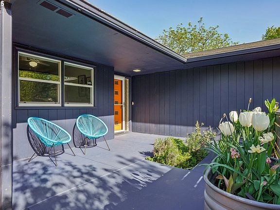 This well-maintained mid-century modern home sits on a beautifully treed lot with a flowing creek, offering natural beauty and a sense of seclusion while still being conveniently close to shopping and restaurants. Inside, you'll find a bright and airy living and dining room combo featuring stunning hardwood floors, a gorgeous statement fireplace, and abundant natural light. The home offers two spacious bedrooms upstairs and a flexible lower level that the sellers have used as a primary suite or a cozy family room. Recent updates include a new heat pump installed in 2024 with a transferable warranty, new attic insulation in 2024, updated plumbing in 2019, hot water heater from 2018, and new electrical panel 2023. The yard is a gardener’s dream, featuring fig, apple, and pear trees, along with goumi berries, blueberry bushes, non-invasive blackberries, and edible oyster and garden giant mushrooms. With a peaceful, well-maintained creek running along the back and character throughout, this charming home is a true retreat, offering the perfect blend of modern updates and timeless style.