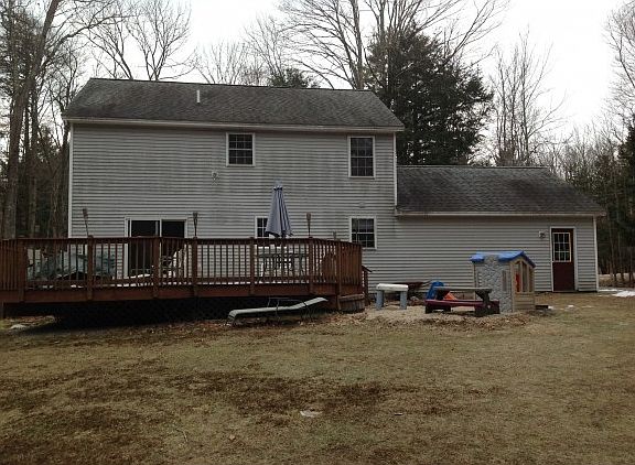 Set back off the road, this Colonial built in 2000 on 3.43 wooded acres is convenient to 101 and minutes to Peterborough Center. Formal living room, dining room with slider to oversized deck, office, spacious kitchen, hardwood floors and 3/4 bath with stackable washer and dryer. Second floor has three bedrooms with wall to wall carpet and full bath. First floor, upstairs hallway and bath freshly painted. Town water and sewer a plus.