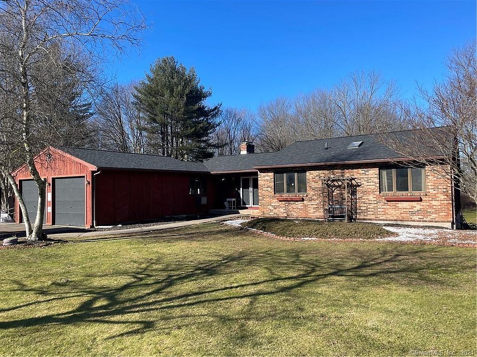 This spacious ranch offers 3 bedrooms, 3 full baths, 2 car garage 4.7 acres, barn and a pond. Walk into the huge tile foyer which leads to the kitchen. The large eat-in kitchen has an induction stove top, an island, breakfast bar and new garbage disposal. Laundry room is off the kitchen which leads to the 2 car garage. Great size dining room off the kitchen with sliders to the large deck with gazebo. Huge living room with a gorgeous fireplace and bay window overlooking the backyard. At the end of the hallway there is a doorway framed out under the sheetrock which would lead to another bedroom. The builder opted to enlarge the primary bedroom instead but made the door opening for the third bedroom in case someone wanted another bedroom. Primary bedroom has a large bathroom with a whirlpool bath and separate shower. The lower level offers a large family room, bar area, bedroom , large cedar closet and full bath adding an additional 932 square feet. Lower level full bath has new grinder. There are a couple out buildings, a barn and a pond. This property has 2.9 acres in East Windsor and 1.8 acres in Ellington for a total of 4.7 acres. Taxes in Ellington is not reflected which is an additional $211. New roof installed. Property is being sold in AS-IS condition. Don't miss this great property. Tons of great options with this property.