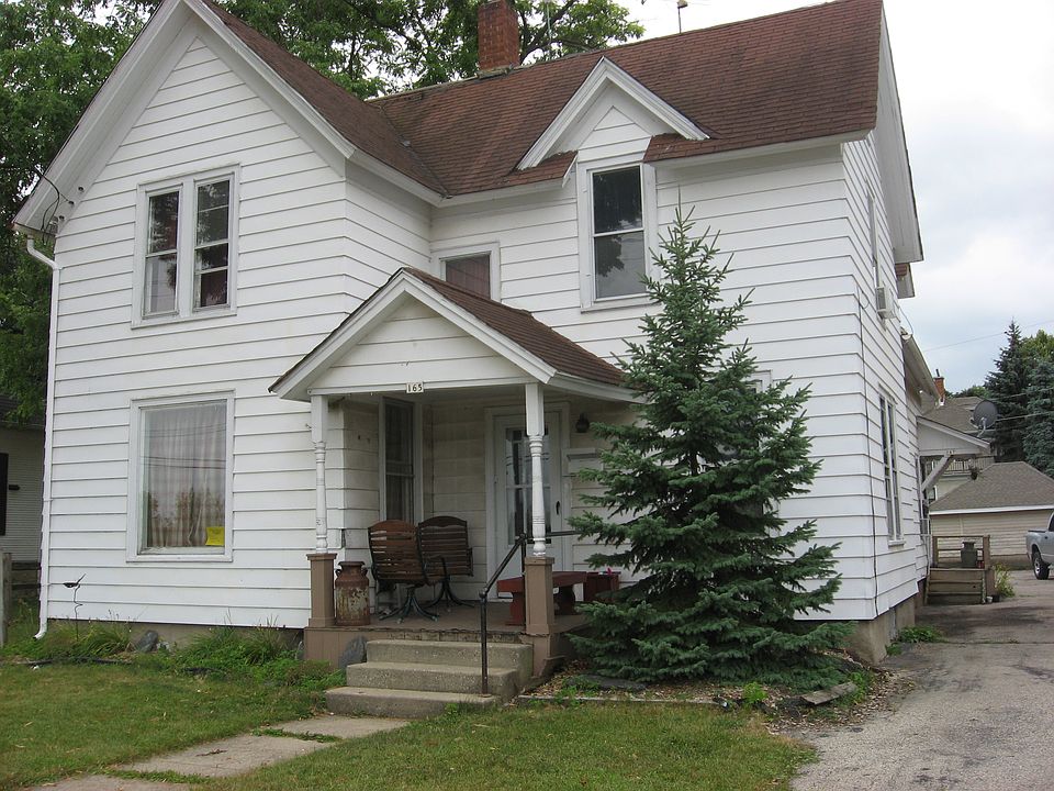 Duplex building on Pine Street in Burlington, WI. 2088 square feet. Units are front and back. Each unit has two levels and a basement area. Upper floor includes two bedrooms and a bathroom. Main floor includes a kitchen, living room, and dining area. There is a small yard, a shared screen porch, and off-street parking.