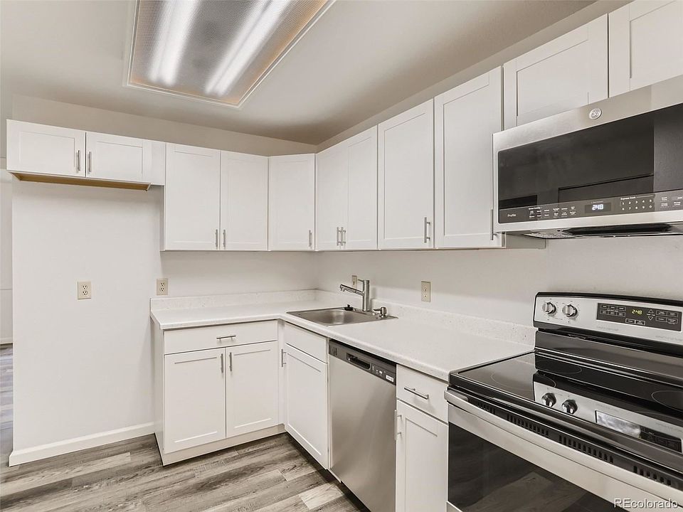 Back on the market due to buyers finances. It's your chance! Get a fresh start with this completely remodeled single bedroom, one bath condo located in the heart of Aurora. This condo has been updated throughout with fresh paint, luxury vinyl flooring, and appliances; which all add to the contemporary fresh feel of the interior. The kitchen has beautiful new white cabinets with modern silver pulls that coordinate nicely with the dishwasher, stove and over the range microwave. The bedroom features a large closet and lots of natural light. A new furnace and water heater will give extra peace of mind in your investment. This condo is located in close proximity to public transit, light rail and within walking distance of shopping and a variety of restaurants, including In N Out! A short walk or bike ride will take you to enjoy the serenity of the duck pond at City Center Park. The unit also comes with a reserved parking spot.