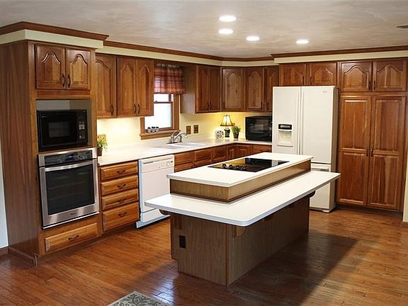 Nicely updated ranch home featuring three bedrooms, two full bathrooms on 4+ private acres. The kitchen features a center island with breakfast bar and electric cook top, built in oven and plenty of cabinets. The dining area features a corner gas fireplace, beautiful views and sliding door to deck. Great formal living room with new walls, plaster ceiling, hardwood floors and large picture window The spacious three bedrooms boast large closets including walk-in closet in master bedroom. Enjoy the view from the covered front porch or the large back deck. The unfinished basement is great for workshop or to finish (woodburning stove not hooked up never used by seller "as is"). In addition to the two car integral garage with newer doors and door opener is an oversized one car detached garage with concrete floor. The newer driveway and retaining walls are a great addition to this home. Great country home with plenty of room to roam through the wooded lot.