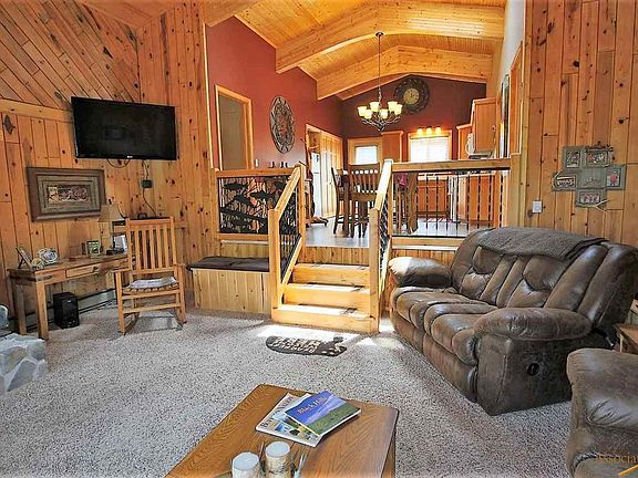 This. Is. It. That Black Hills cabin you were searching for is right here. It's remodeled and the perfect blend of rustic cabin and modern feel. Natural pine encases the vaulted ceiling throughout the kitchen, dining room and sunken living room. Two bedrooms are on each side of the kitchen/dining room area, each with built-ins in the closet. The stackable washer/dryer off the kitchen stays. Step down to the carpeted living room. The classic wood burning fireplace and stone hearth is perfect for those snowy days. Walk out to the deck through the glass sliding doors and listen to the birds and wind through the trees. The deck wraps around 3 sides of the house! On one side of the detached garage is the bunkhouse: a one-bedroom hideaway with wood floors, pine walls, and a pellet fireplace. The garage is oversized with room for your car, toys, and a workspace for your tools. It's heated, and the floor is painted! Minutes away from Pactola Lake and half an hour to Rapid City limits. All on .46 Black Hills acres. Gotta check it out! Listed by Tristan Emond, Mindful Living Realty, 605-391-7086.