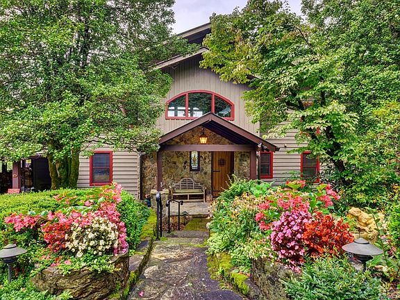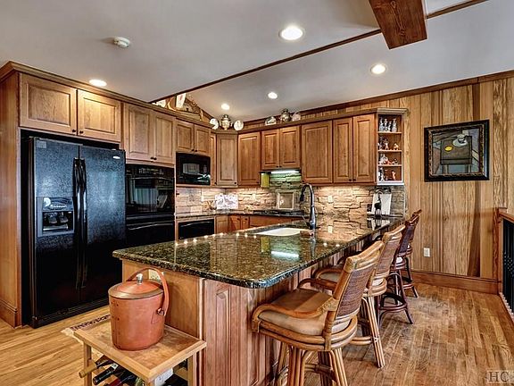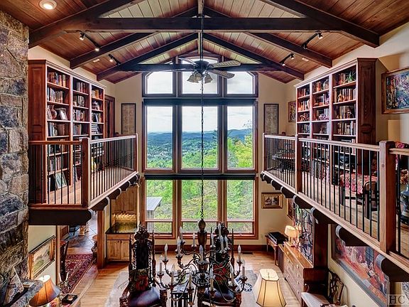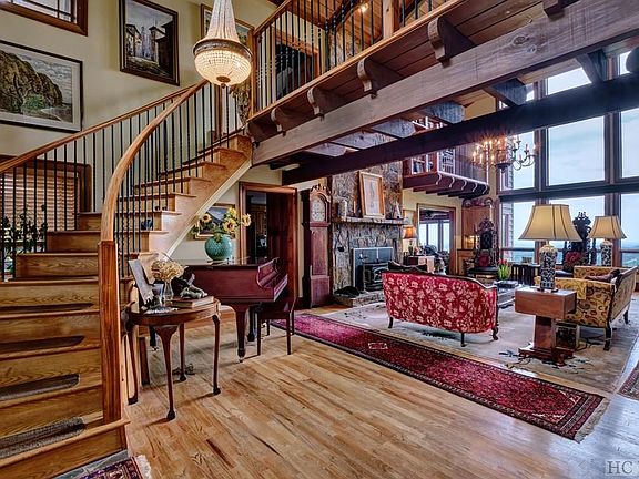 Enjoy breathtaking long-range views over Blue Valley from this well loved and maintained home, less than 2 miles and only 5 minutes to Highlands Main Street. The 1.82-acre property is gated, beautifully landscaped with a stream and completely private. Featuring extraordinary architectural details, this amazing 4 bedroom/4 full and 2 half-bath vintage mountain home was completely restored and restyled in 2008 using the highest quality materials and workmanship. The main living space is grand with high vaulted ceilings, original stone fireplace and massive windows and opens to the dining area, kitchen and sunroom. The master suite, a powder room and laundry are also on the main level. The sweeping curved staircase in the entry accesses the balconies overlooking the great room, a large family room with a 2nd fireplace, study, second powder room and two guest suites, each with private baths. The lower level has a suite with a large living area, screened porch, bedroom, bath and sauna. Each level is serviced by an elevator. Total living area is 4,243 sq. ft. per 3rd party appraisal. The open deck with fireplace is the ideal spot to enjoy the exceptional view. Other features include: 2 dual-fuel multi-zoned HVAC systems, metal roof, recently upgraded plumbing and septic systems, encapsulated crawl space and connection to the Town of Highlands water system. This is truly an idyllic mountain retreat. 3D Tour available upon request.