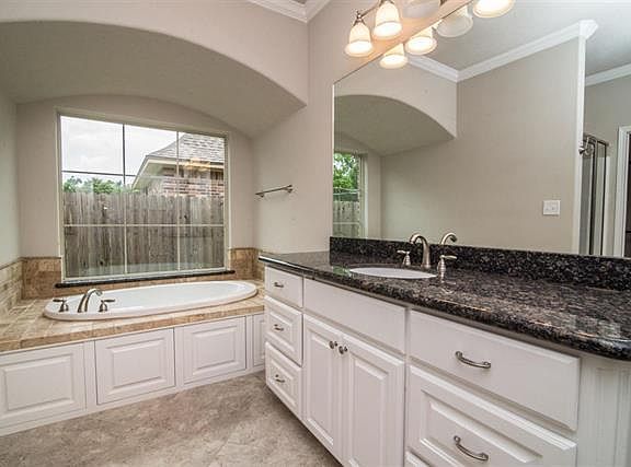 3 bed, 2.5 bath home boasts a split floor plan with high tray ceilings, crown molding throughout, an open kitchen with a large walk-in pantry, laundry room, neutral color and matching white cabinets with granite counter tops through out. The large Master Suite offers a huge walk in closet, double vanity with separate garden tub and a flex area that can be used as a reading/office nook (currently being utilized as a nursery). Enjoy the large back yard on a covered back patio with fan. Oversize garage offers extra storage space and large driveway is a plus. Quick access to all shopping and schools.