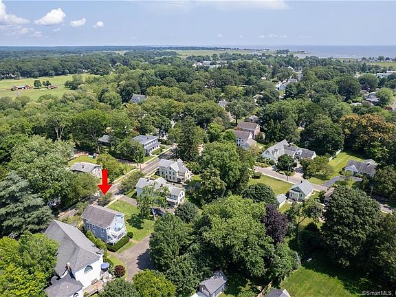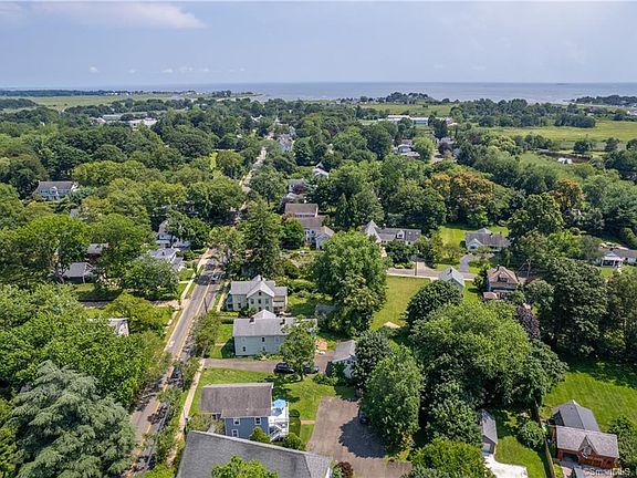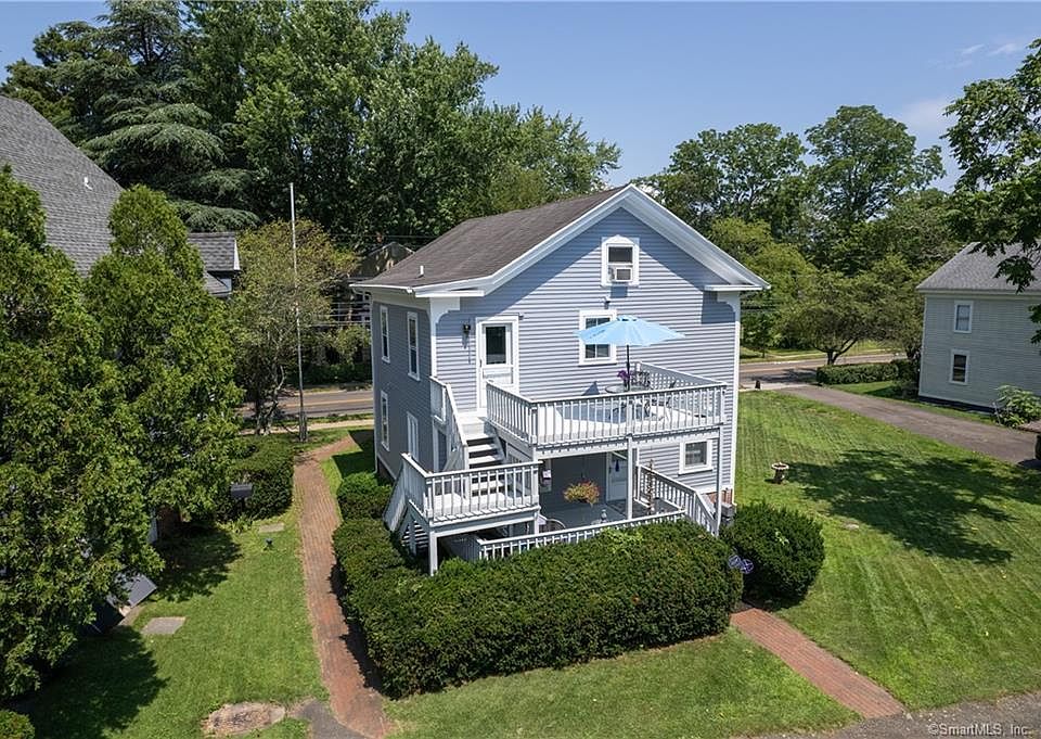 The second floor apartment has private access from the gracious front door and the upper deck at the back of the house. There is a Living Room with Dining area, a nicely sized bedroom with two closets, The full bath has both a shower stall and jetted tub. The eat-in kitchen is fully applianced. There is a separate half bath with washer and dryer. Unique to this apartment is the finished loft in the attic space. The area over the Dining room has a cathedral ceiling and is flanked by the stairs to the loft. The loft is a very interesting space and could be for sleeping, working at home or yoga/meditation. the floors are carpeted on the second floor and loft area. The basement has a concrete floor and has been compartmented for individual unit storage. The yard is level and has shade trees to the rear. There is parking for six cars. Just a block from the historic Guilford center there is access to restaurants, shops, public library and the beautiful Guilford Green. The town marina with restaurants and stunning views and the town beach are about a half mile directly south. Since the commuter train station is only two blocks from this property it is a perfect set up for someone to use the house as a weekend get-away from the city. The exterior of the house was completely renovated in 2022.