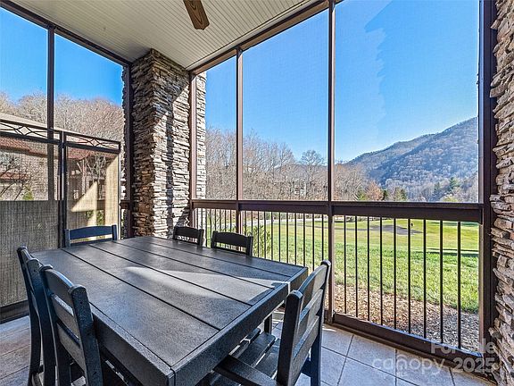 Gorgeous mountain views await you from this Maggie Valley Club Condo! This 2-bedroom, 2-bath retreat features an expansive screened porch—perfect for sipping your favorite beverage while soaking in the stunning scenery,& mountain views. The cozy living room with gas log fireplace offers the same breathtaking views. The spacious primary suite includes dual sinks, luxury tub, and separate shower. The second ensuite bedroom is generously sized with a walk-in closet. The kitchen boasts stainless steel appliances, granite countertops, and a breakfast bar. Offered fully furnished in tasteful style, making it ideal for short-term rental potential. Sports membership provides access to tennis and pickleball courts, a fitness center, a pool, and golf discounts. The monthly HOA covers propane and a Spectrum basic package. Perfect mountain get-a-way, for full time, second home or rental. Close to skiing, hiking, fishing, casino, and of course GOLFING!