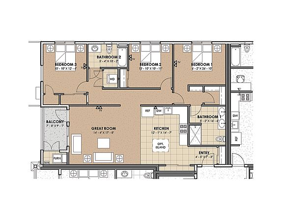 Massive great room and kitchen, the 3-bedroom at Ponderosa Parkway has it! Three well sized bedroom, 2 bathrooms and a laundry room the three bedroom is gorgeous and practical. From the great room, enjoy views off the fully covered balcony. Create a private space in the master bedroom with additional storage and walk-in closet. For any of our floorplans enjoy our optional Interior Design packages.*The Base Square Footage includes 70 SF of exterior space