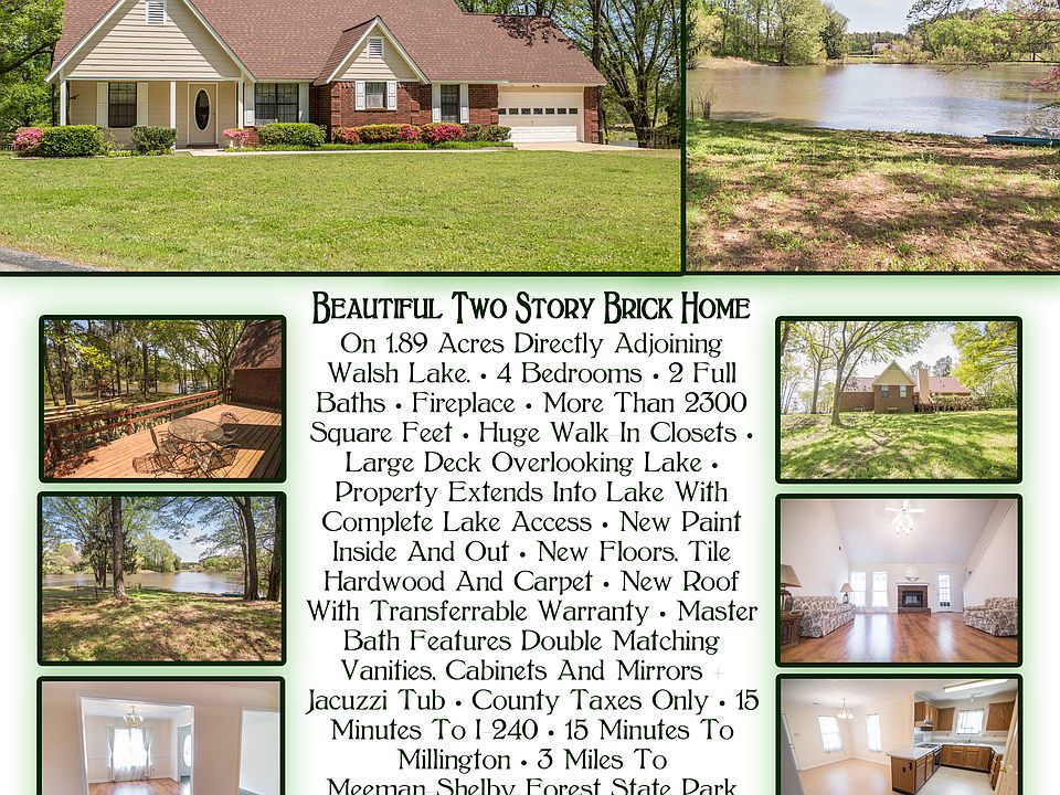 Beautiful two story Brick Home on 1.89 acres directly adjoining Walsh Lake. 4 Bedrooms * 2 Full Baths * Fireplace * More than 2300 square feet * Huge walk-in closets * Large Deck overlooking Lake * Property extends into Lake with full lake access * New Paint inside and out *New Floors Laminate, Tile and Carpet * New Roof with Transferable Warranty * Master Bath features Double Matching Vanities, Cabinets and Mirrors * Jacuzzi Tub * Large attached two car garage * County Taxes Only * 15 minutes to I-240 * 15 minutes to minutes to Millington * #3 miles to Meeman-Shelby Forest State Park