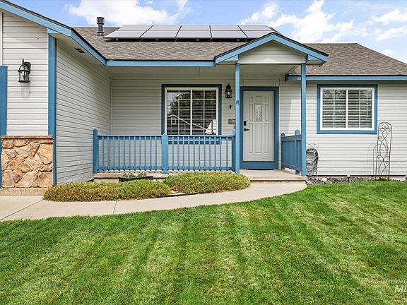 Beautifully maintained 3-bedroom, 2-bath single-level home in Mountain Home with a desirable split bedroom design. Guests are greeted to an inviting living room highlighting vaulted ceilings and newer waterproof vinyl plank flooring. The kitchen features stainless steel appliances, a center island, and is open to the dining area. The spacious primary suite offers a large walk-in closet with a sitting area and additional storage/closet. Additional 2 bedrooms and full bath are nice sized and provide privacy from primary suite. Laundry also has plenty of storage, cabinets and built-ins. Exterior amenities include a fully fenced yard with front and back sprinkler systems, a new garage door, and a garage with extensive built-in storage. West side of home provides additional parking/small storage area. Energy efficiency is enhanced with owned solar panels, providing long-term savings. This home combines functionality, comfort, and thoughtful updates—ready for its next owner.