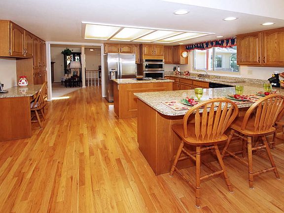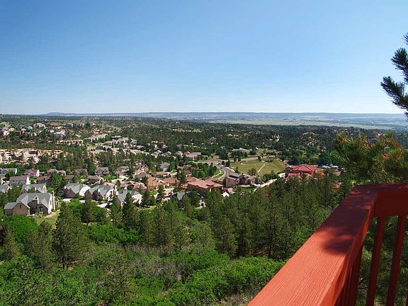 Gorgeous Rancher in Hunters Point, high on Ridge line w/360 degree views, Secluded, treed lot on 1.4 acres, adjacent to open space w/hiking trails* main level living, hardwood floors, two fireplaces,5 decks w/unsurpassed views of mts, City, Blk Forest, USAF,Gourmet Kitchen w/granite-slab countertops, all stainless appliances, island w/Jenair cooktop & Lg Breakfast bar Very open great room includes kitchen, informal dining, family room, & 2 Bay Windows* New Carpet, New Stucco.New Decorative pebble stone front walkway, Amazing lot with views and pines, aspen, and scrub oak trees * Newer refrigerator, new oven, microwave oven and dishwasher * Panoramic views from every window even the master bedroom shower has a view * Master bedroom with 8x20 private deck * Formal living room with gas fireplace, bay window * Formal dining room with sliding door to 33x14 deck with amazing views * Incredible space for entertaining * Lower level 17x26 family room with walk-out to 16x20 deck * Two large lower level bedrooms * Huge 24x28 Garage * 3 main level bathrooms have new Granite Transformation countertops, new sinks and new fixtures. OR: Informal Dining Area with Bay Window OR: Second Family Room with Walk-out to 16x20 Wood Deck OR: Huge 2 Car Garage loaded w/ space for storage & workshop