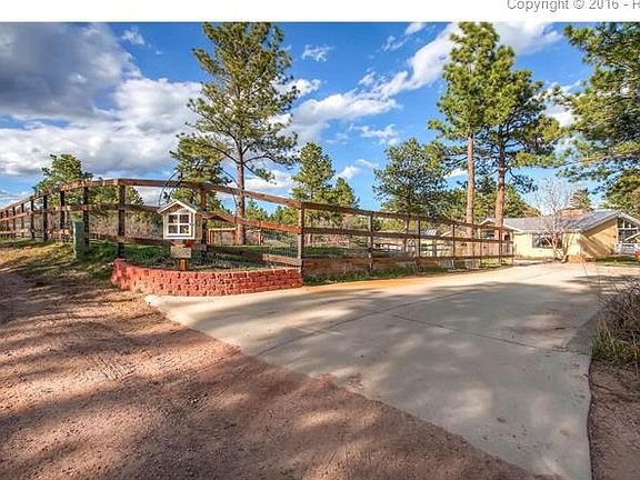 Beautiful custom ranch style home on a quiet cul-de-sac, nestled against the trees, in desirable Woodmen Valley. The inviting double french doors open up to a tile entry way that features high wood beamed ceilings. Step down into the sunken family room that has built ins and room for a small desk. The living room has an exposed brick gas fp and large windows with more french doors leading to the bright, sunny kitchen. The built in seating in the kitchen nook can sit up to 8. The kitchen features an island, gas cooktop double built in oven, solid granite counters, new stainless dishwasher, new stainless refrigerator, tile back splash, and a flat screen TV. Look into the butlers pantry that has lots of storage and room for an additional freezer or refrigerator. A comfortable master bedroom has sliding glass doors to lead you out to the huge deck. The master bathroom is handicap accessible with a double sink, a double shower head shower, and a large walk in closet. Downstairs you find 2 large bedrooms, a double sided fireplace, a wet bar and rec room for your entertaining. This home is on 3.44 acres and in front of the home, a stunning orchard surrounds a fire pit with 5 swinging benches. Storage galore in the home plus oversized 2 car garage, plus a one car garage, plus a barn. The huge backyard has a 60' x 40' garden, a greenhouse, another fenced area for animals, a play structure, and lots of open space. A creek babbles along the north side of the property. This relaxing retreat is located in the esteemed D20 schools with nearby hiking, dining, shopping, and convenient access to I-25. The 1959 wishing well adds charm to the drive up to this home. Pride of ownership in this home with new interior paint and a new metal roof in 2014! Don't miss this one!