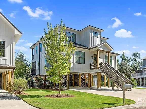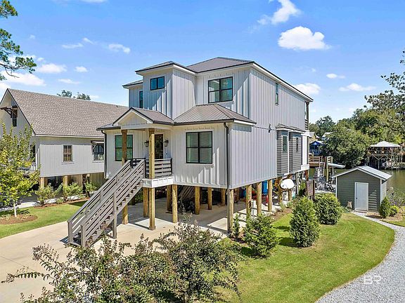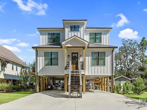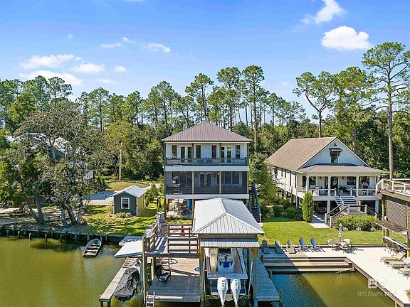 Nestled along the serene banks of Fish River in Fairhope, this custom-built home by Creel Construction, finalized in 2021, offers a perfect blend of modern luxury and waterfront living. With 4 bedrooms, 3.5 bths, and office, this open floor plan is thoughtfully designed to accommodate both family life and visiting guests. Featuring Beautiful hardwood flooring and 10ft ceilings throughout the main living areas. The kitchen is a culinary haven, solid stone countertops, custom cabinetry, stainless appliances, a gas range, and an expansive kitchen island with picturesque river views. The primary bedroom, located on the second level, has stunning views of Fish River, large ensuite bath with expansive walkin shower and walk in closet. A large living/rec room is located just off the primary bedroom. Two additional bedrooms, a bathroom, and laundry are located on the second level as well. The private guest suite with ensuite bath and located on the main level, provides a welcoming space for visitors or family members. Step out to the porches on both levels and savor breathtaking river views. An expansive entertaining porch just off the main living area offers endless opportunities for outdoor enjoyment. Beneath the home, you'll find ample storage and entertainment space, ideal for gatherings and creating lasting memories. Embrace the river lifestyle with a newly constructed wharf featuring a 16k boat lift and a jet ski ramp – the key to countless aquatic adventures. The spacious back yard is a versatile haven, including a wood-burning fireplace for cool evenings and al-fresco dining. Whether it's your permanent residence or a wise investment, this Fish River gem offers a lifestyle dreams are made of. Endless possibilities await at this riverfront retreat, providing you with the serene, luxurious life you've always envisioned. All Information provided is deemed reliable but not guaranteed. Buyer or buyer’s agent to verify all information.