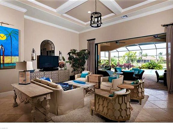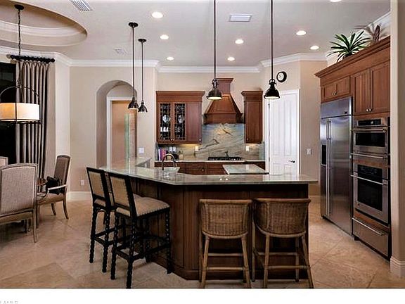 Stunning former Stock model boasts four bedroom, 3 1/2 baths and features an open great room design with views of water and a fountain in Mediterra's Buonasera neighborhood. Ten foot pocketing sliders opening to the outdoor living area create the perfect combination for Florida living. Stone floors, custom cabinets and marble countertops are only a few of the features in this 3202 square foot home. Fully furnished.