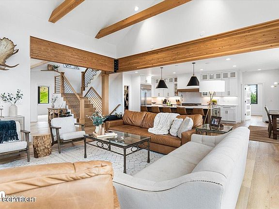 Enjoy the stunning mountain, city, and water views with this beautiful Scandinavian influenced mountain house. Smoked French oak floors and unique black windows, large finished basement with a spa like sauna and a four car 1400 sq ft garage for all the Alaska toys. Large flat yard and tons of usable space including RV/boat parking.There is a bonus room on the top floor and an office on the main level. This home has a generator and A/C hooked up. Come see this rare hillside family home!