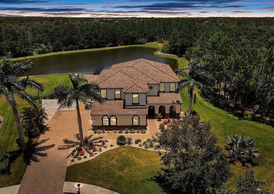 A masterpiece home on a magnificent setting in the sought-after Rye Wilderness Neighborhood and with pond & preserve views! Built with a Spanish style architecture and a charming front porch with arches welcome you to this spacious & completely remodeled two-story home. Grandeur and elegance flow throughout this unique Marbella floor plan, beginning with its exquisite new laminate wood-like plank flooring throughout the entire house, five bedrooms, four bathrooms and two half bathrooms in this home with tile roof, three-car side load garage, paver driveway, with an extended driveway, including a half court for basketball and sitting on a half-acre lot on one of the only cul-de-sac lots in the neighborhood. Double glass impact resistant eight foot doors open to a long hall aligned with a dramatic staircase with Juliet balcony and sightlines to the impressive outdoor oasis & preserve views that await your step forward. The home features plantation shutters, crown molding, and an impressive kitchen that is well-equipped with top-of-the-line stainless steel appliances, quartz counters, double ovens and solid wood cabinets with more drawers and pullouts, than you could ever need! The design includes an extended island with a gorgeous eat-in area and a butler’s pantry just off the family room. Just open up to the magnificent pool area with a one-of-a-kind view. This stunning pond and forest backed outdoor area will surely take your breath away, incredible salt water pool and spa with water cascades, sun shelfs, travertine, an impressive top of the line outdoor kitchen with two vented hoods for the BBQ and flat grill, two various drink fridges, granite counter tops, three built-in adjustable louvered pergolas giving you ultimate control of how much shade you have, your own private putting green for the golf amateur in you, a beautiful firepit area, most impressive is the tranquil and serene view of long pond with preserve behind, for nature and privacy at its best, and of course your very own private waterfront to fish from your backyard. The first of the five bedrooms is one of the two masters, that is vaulted with accent beams and was created uniquely for this house on the first floor, with a one of a kind en-suite bathroom and walk-in closet. The additional four bedrooms, four bathrooms and a bonus room are upstairs. The owner’s retreat is a relaxing haven, with double eight-foot door entry to the spacious bedroom with tray ceiling and windows viewing to the back of the home, two gigantic walk-in closets, an enormous en-suite master bath with dual vanities, a garden bath with relaxing soaker tub and walk-in shower, also with windows lining the backyard view. Two of the remaining bedrooms are larger than the norm and each have their own bathrooms connected with the last set to the front of the home. Rye Wilderness is known for its generous lot sizes, proximity to great schools, quality-built homes, and offers amenities such as sports courts and a playground. It’s only a short drive to Lakewood Ranch, Sarasota, Anna Maria Island and Saint Pete for their great shopping, dining, entertainment, and our world-famous Gulf Beaches! NO CDD's in this neighborhood and low HOA’s makes this the perfect setting for your new home. Entire house with water softener and reverse osmosis, Garage is equipped for plug in Tesla fast charger or any other EV. Fenced in yard ready for your puppies. Comes with a transferable Home Warranty. A must see!