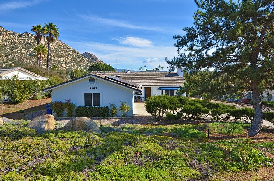 Spacious Country Home on appx. 1/2 acre. Quality features include FP in living room w/rock surround, skylights, dual pane windows. Eat in kitchen has Silestone counters & stainless appliances. Private Master Suite has wood shutters, rear yard access and remodeled bath. Over 1000 SF of near new porcelain flooring, AC unit and roof. Backyard is an entertainers delight with large covered patio, spa, lush landscaping, fruit trees, dog run, breathtaking views. Solar is paid for, not leased. 3 CAR GARAGE Appx. 816 SF with tons of cabinets. ROOF: New roof installed 9/2014. 2 new layers of 40 pound underlayment and existing roof tiles reset. A/C: New 4 ton 13 SEER York LX Series unit installed 2014 including ducting. SOLAR: Purchased and installed 4.24 kW photovoltaic solar system. FLOORING: New MARAZZI- Montagna Rustic Bay 6 in. x 24 in. Glazed Porcelain wood look tile throughout the living room, dining room, kitchen, hallways, entry way, bathrooms, laundry room and front bedroom. WINDOW COVERINGS: New Bali 2 in. wood blinds in living room, dining room, front bedroom and master bath. KITCHEN APPLIANCES: Dishwasher and microwave were replaced with new stainless appliances in 2013. New stainless stove was installed in 2016. BATHROOM VANITIES: New Onyx DOOR HARDWARE: All interior door knobs were replaced in 2016 w/Kwikset Balboa Venetian Bronze Lever style hardware and matching accessories. PLUMBING: 50 gallon water heater and house pressure regulator valve installed in 2015. CABINETRY: Kitchen, bar, bathroom and hallway closet cabinets refinished in 2016. RAIN GUTTERS: New rain gutters were installed in 2016 along front and back of the house and garage